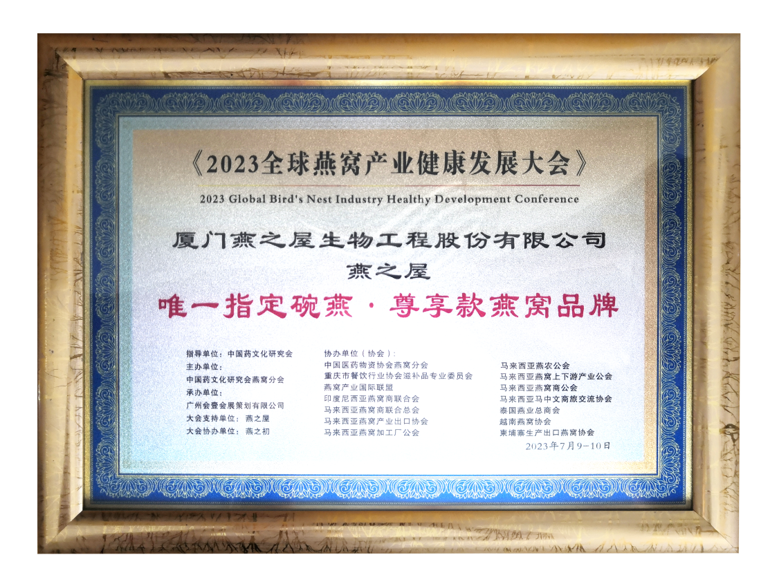 圖:燕之屋獲2023 全球燕窩產(chǎn)業(yè)健康發(fā)展大會支持單位牌匾