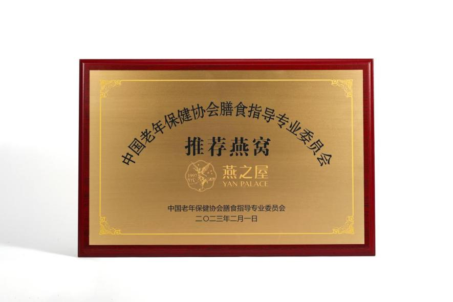 燕之屋榮獲“中國(guó)老年保健協(xié)會(huì)膳食指導(dǎo)專(zhuān)業(yè)委員會(huì)推薦燕窩”牌匾