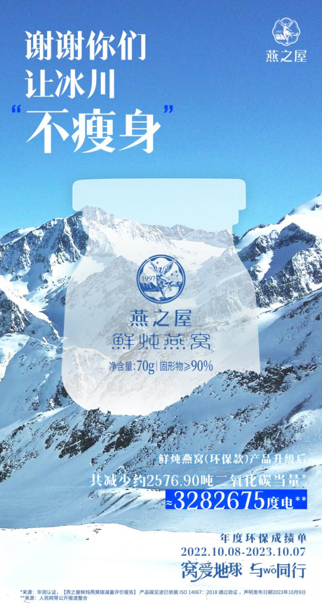 作為新華社品牌工程成員企業(yè)、燕窩行業(yè)“領頭燕”,燕之屋以助力“雙碳”目標為發(fā)展旗幟,積極投入綠色轉(zhuǎn)型、創(chuàng)新綠色生產(chǎn),減碳成績相當亮眼。10月25日,燕之屋在北京舉辦新一代鮮燉燕窩發(fā)布會暨年度環(huán)保成果報告會,正式推出年度環(huán)保新品——燕之屋新一代鮮燉燕窩,并揭曉年度環(huán)保行動成果,公布碳排放測定數(shù)據(jù)。2022年10月08日至2023年10月07日,鮮燉燕窩(環(huán)??睿┊a(chǎn)品升級后約減少2576.90噸二氧化碳當量*,減少的二氧化碳排放相當于種植了170656棵樹木一年吸收的二氧化碳**。減少的二氧化碳排放相當于384公頃綠地(以麥冬為參考)一年吸收的二氧化碳***。減少的二氧化碳排放相當于節(jié)約了3282675度電,節(jié)約了2831758噸水****(*來源:華測認證,【燕之屋鮮燉燕窩碳減量評價報告】 產(chǎn)品碳足跡已依據(jù) ISO 14067:2018 通過驗證 ,聲明發(fā)布日期2023年10月9日。**來源:第三方機構(gòu)根據(jù)《2006年IPCC國家溫室氣體清單指南》,計算得出中國境內(nèi)人工林平均每棵樹每年產(chǎn)生的碳匯量約為15.1kg。***來源:參考《天津市城市綠地碳匯設計導則(試 行)》****來源:人民網(wǎng)等公開報道整合)