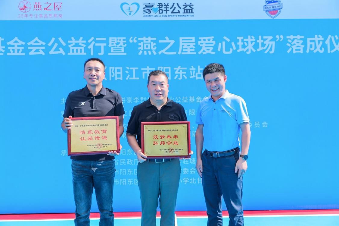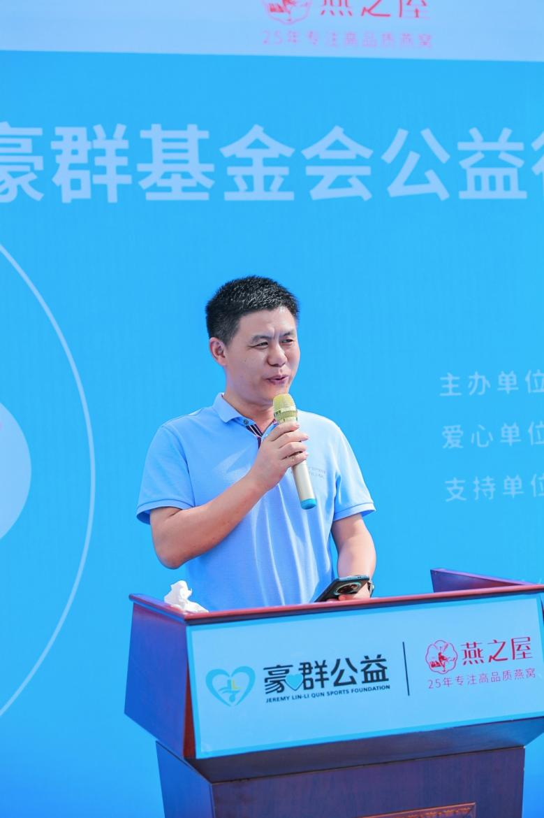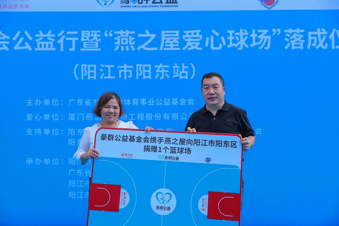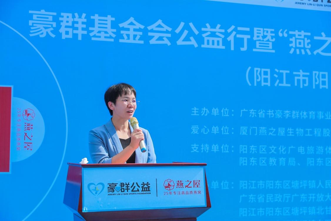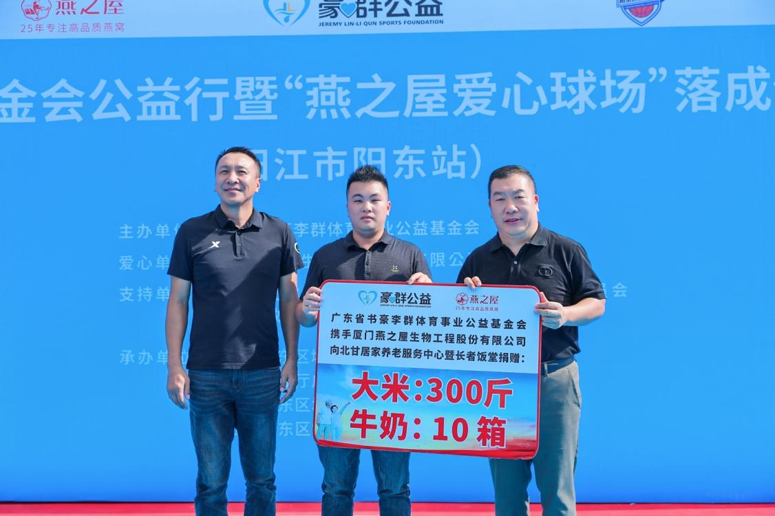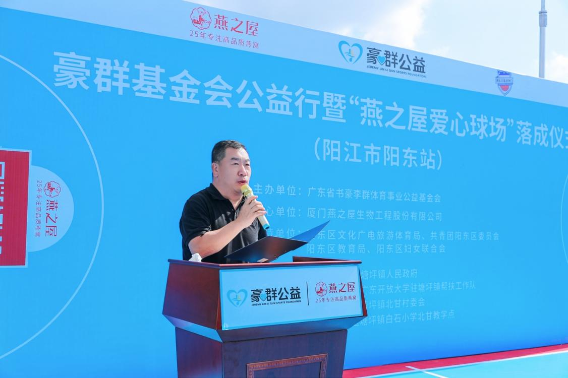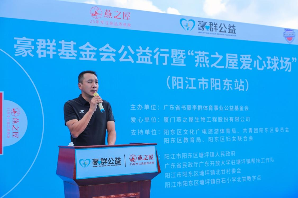 廣東省第十三屆政協(xié)委員、中國籃球名宿、廣東省書豪李群體育事業(yè)公益基金會理事長李群在致辭中提到,9月份,豪群基金會攜手愛心企業(yè)燕之屋和燕之屋總裁李有泉,一同為陽東區(qū)捐建的公益球場率先在北甘村完工,為村民提供全新的運動場所,并對燕之屋以及燕之屋總裁李有泉對公益的關(guān)注和支持表示感謝。