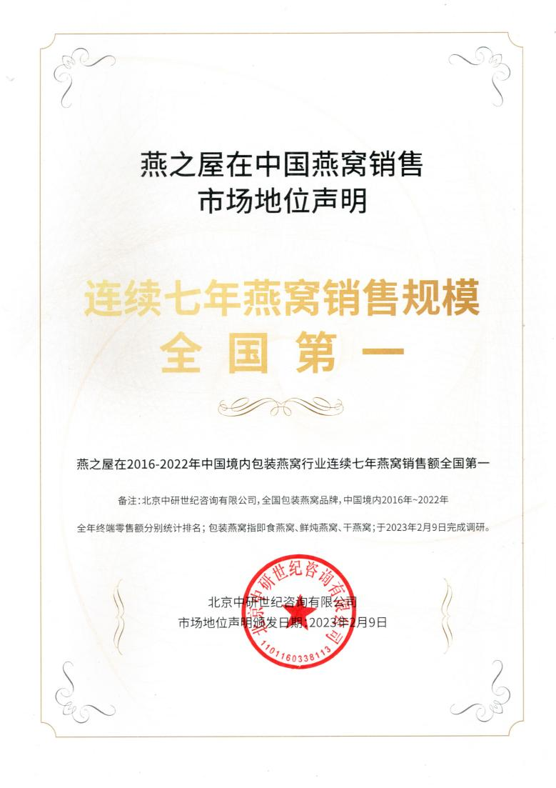 為滿足消費(fèi)者越來(lái)越多元的滋養(yǎng)需求,推動(dòng)企業(yè)高質(zhì)量發(fā)展,燕之屋創(chuàng)新研制純燕窩產(chǎn)品、“燕窩+”產(chǎn)品及“+燕窩”產(chǎn)品三種類(lèi)別多款燕窩產(chǎn)品,總共有250個(gè)SKU。憑借更健康、更安全、更營(yíng)養(yǎng)、更便捷的產(chǎn)品屬性與優(yōu)勢(shì),產(chǎn)品銷(xiāo)量連續(xù)七年全國(guó)第一。截至2022年,燕之屋已連續(xù)七年燕窩銷(xiāo)售規(guī)模全國(guó)第一*(*燕之屋在2016-2022年中國(guó)境內(nèi)包裝燕窩行業(yè)連續(xù)七年燕窩銷(xiāo)售額全國(guó)第一,備注:北京中研世紀(jì)咨詢有限公司,全國(guó)包裝燕窩品牌,中國(guó)境內(nèi)2016年-2022年全年終端零售額分別統(tǒng)計(jì)排名;包裝燕窩指即食燕窩、鮮燉燕窩、干燕窩;于2023年2月9日完成調(diào)研),高品質(zhì)、好口碑兼具,是名副其實(shí)的燕窩行業(yè)“領(lǐng)頭燕”。