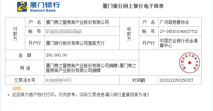 圖:燕之屋向甘肅省臨夏州積石山縣捐贈救災(zāi)資金20萬元