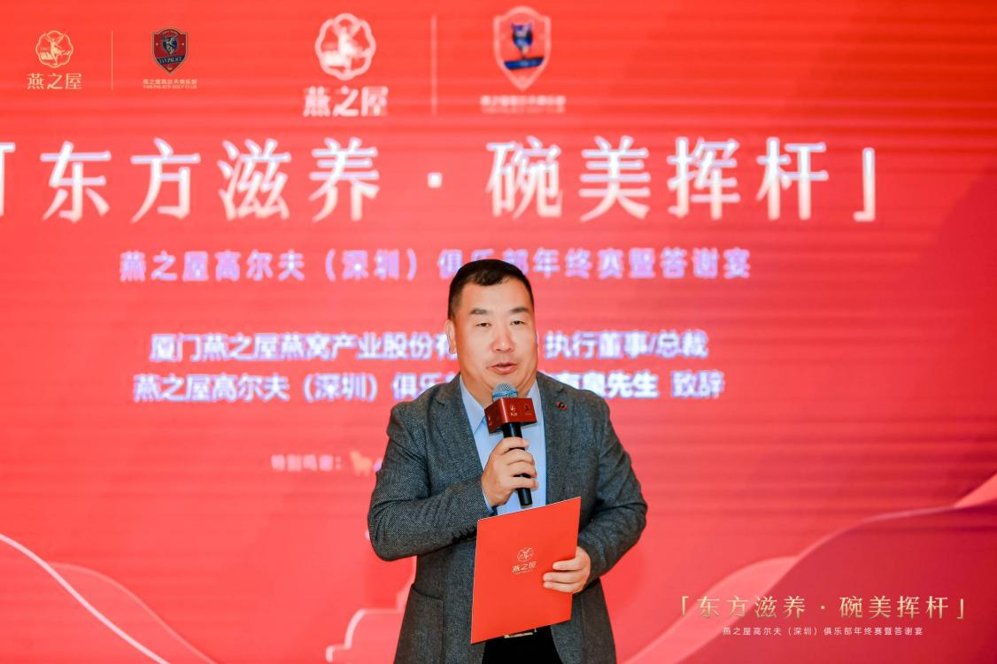 比賽結(jié)束后,所有嘉賓以及會(huì)員共聚答謝宴,品鑒佳肴、再續(xù)情誼。燕之屋執(zhí)行董事兼總裁、燕之屋高爾夫(深圳)俱樂(lè)部會(huì)長(zhǎng)李有泉上臺(tái)發(fā)表致辭,并與眾領(lǐng)導(dǎo)嘉賓共同舉杯祝酒。燕之屋*26年專注高品質(zhì)燕窩(*燕之屋指燕之屋企業(yè)),堅(jiān)持“源于天然,美與健康”的品牌理念,匠造健康、營(yíng)養(yǎng)、美味、便捷的優(yōu)質(zhì)燕窩,贏得市場(chǎng)好口碑,于2023年在香港成功上市(股票代碼:01497.HK)。晚宴上,燕之屋旗下高端燕窩品牌“碗燕”產(chǎn)品碗燕·濃鮮款作為頭盤(pán)菜亮相餐桌,其營(yíng)養(yǎng)優(yōu)質(zhì)、口感濃稠,博得一眾好評(píng)。碗燕·濃鮮款甄選東南亞高品質(zhì)金絲燕燕窩,燕窩原料100%正規(guī)進(jìn)口,天然珍貴。采用121℃鮮萃工藝,密封燉煮,牢牢鎖住新鮮,產(chǎn)品0脂肪、0防腐劑、0增稠劑、0添加劑*(*指本產(chǎn)品生產(chǎn)過(guò)程中0%添加防腐劑山梨酸鉀、苯甲酸鈉,0%添加增稠劑瓊脂),是日常滋養(yǎng)的安心之選,也是高爾夫運(yùn)動(dòng)人士的“碗”美拍檔。
