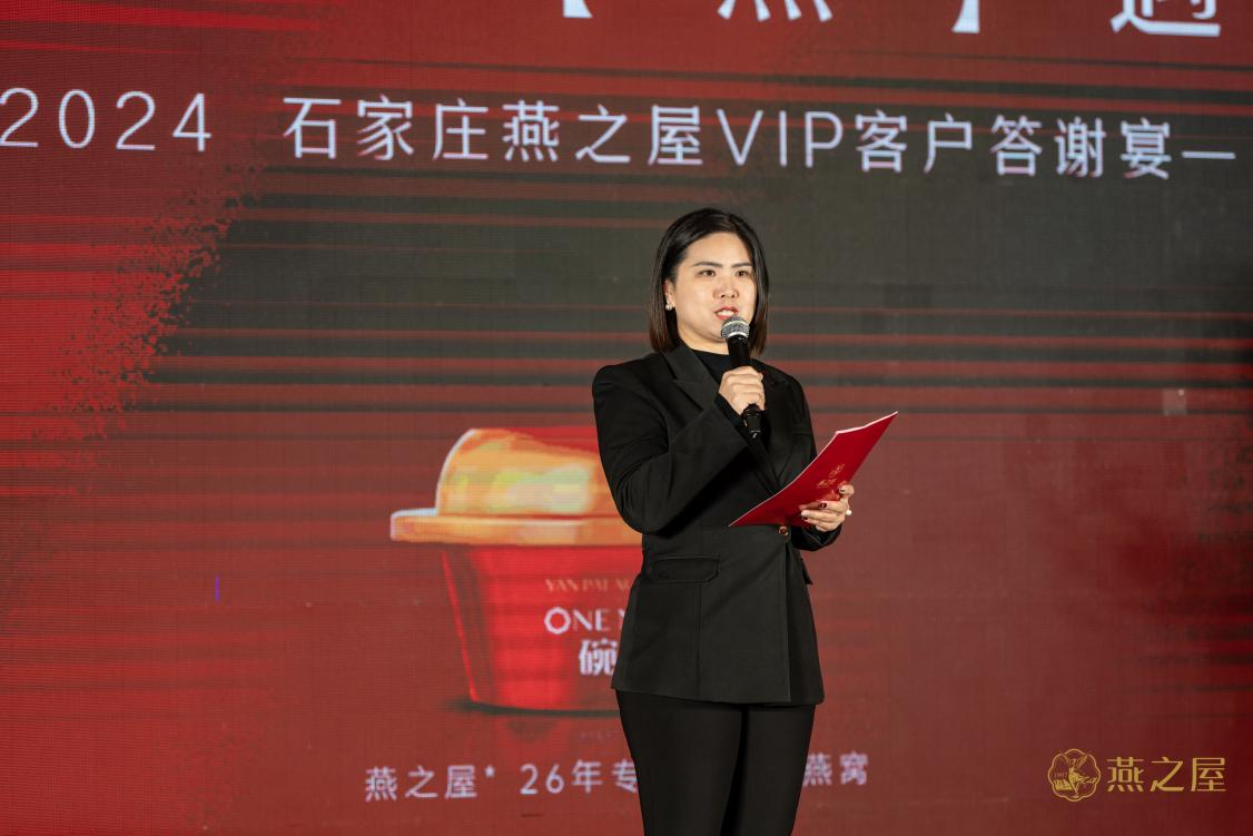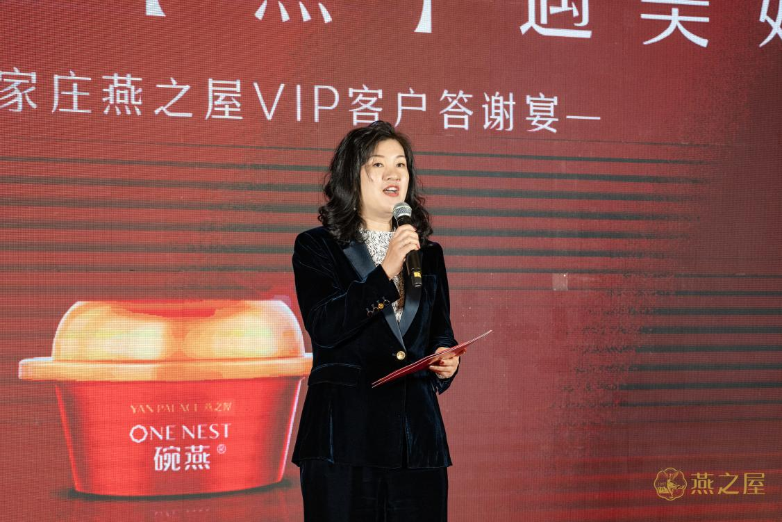 在熱烈的掌聲中,燕之屋石家莊合作商、河北法桐商貿(mào)有限公司總經(jīng)理趙寧上臺致辭,她說道:“在這個特殊的場合,我想表達我們對每一位貴賓的深深感激。正是因為有了您的支持,才有了今年燕之屋在香港的上市(股票代碼:01497.HK)。今年是燕之屋企業(yè)成立的26周年,26個寒暑走過,我們初心不改,終于讓燕之屋成為了家喻戶曉的高端燕窩品牌,用品質(zhì)和服務(wù)征服了數(shù)以萬計的客戶。”她與在座貴賓共同舉杯敬酒,向各位賓朋致以由衷謝意。