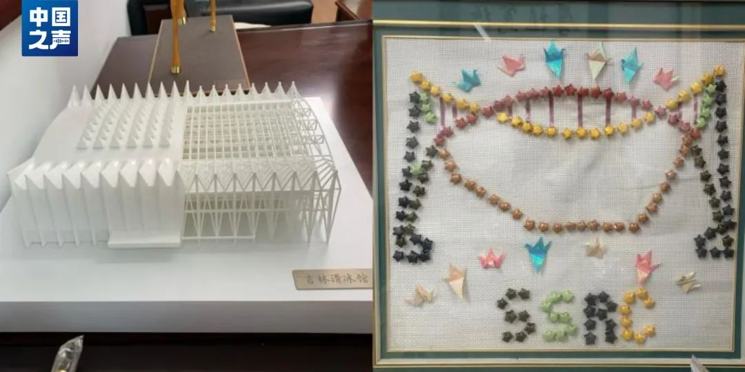 沈世釗的辦公室,一幅手工作品被放在門口最顯眼的位置,那是學(xué)生送給他的禮物。千紙鶴和紙星星拼貼成的雙向拋物線造型圖,定格了回國后的沈世釗在新領(lǐng)域白手起家的開端:參與吉林省滑冰館的設(shè)計(jì)。
