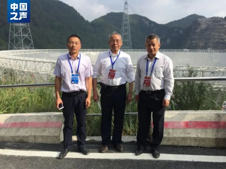圖:沈世釗(中)和團(tuán)隊(duì)成員在落成的“中國天眼”前