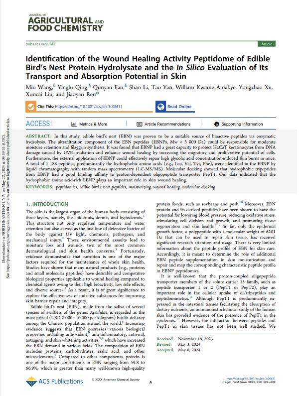 在持續(xù)的研究中,2024年燕之屋聯(lián)合華南理工大學(xué)發(fā)表燕窩肽科學(xué)論文“Identification of the Wound Healing Activity Peptidome of Edible Bird's Nest Protein Hydrolysate and the In Silico Evaluation of Its Transport and Absorption Potential in Skin”被食品科學(xué)領(lǐng)域國(guó)際權(quán)威SCI收錄期刊《Journal of Agricultural and Food Chemistry》正式收錄。該研究表明,“燕之屋燕窩肽可能作為一種潛在的修復(fù)成分,具有抵御外部有害因素的潛在能力,如太陽(yáng)照射和有機(jī)酸。”
