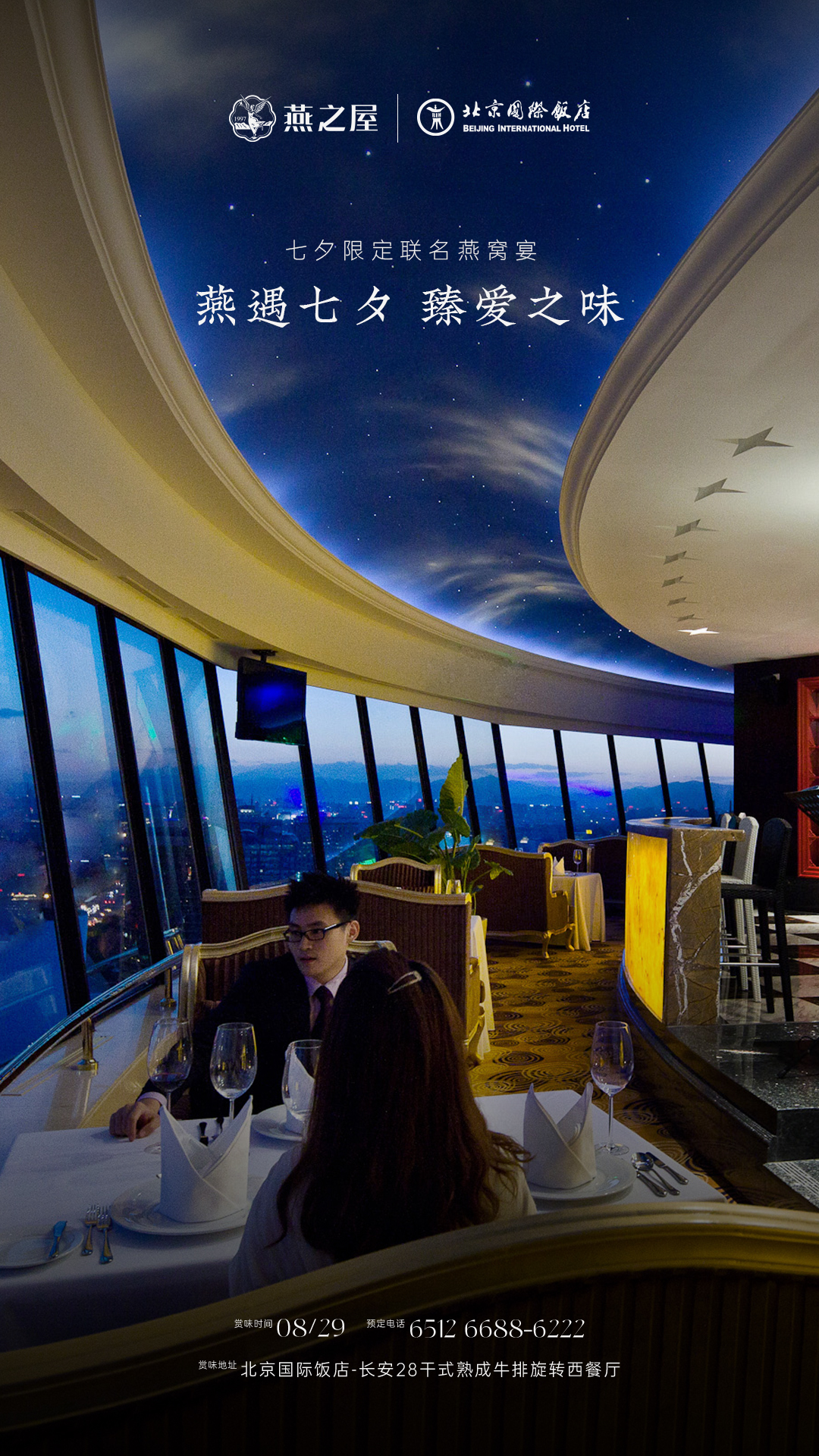 北京國際飯店長安28餐廳作為北京市中心高空360度環(huán)瞰京城盛景的旋轉(zhuǎn)餐廳,以其獨(dú)特的奢華與雅致并存的裝修風(fēng)格,成為京城高端餐飲場所。604㎡餐廳空間、100個(gè)精致餐位,3間多功能廳房,配合專業(yè)的服務(wù)團(tuán)隊(duì),為每位賓客提供尊貴的用餐體驗(yàn)。燕之屋27年專注高品質(zhì)燕窩,始終堅(jiān)持“源于天然,美與健康”的理念,以創(chuàng)新科研賦能上乘品質(zhì),連續(xù)九年高端燕窩全國銷售第一①。此次合作是云端視野與輕奢品味的雙重尊享,正如每一對相約七夕的甜蜜愛侶。