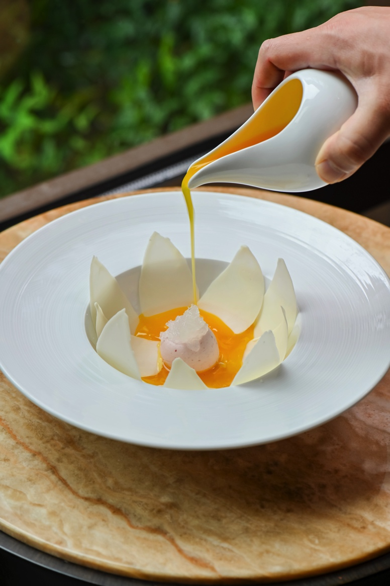 玉蘭花開映燕盞,是一道展現(xiàn)廚藝美學的匠心之作。白巧克力制成花瓣,包裹草莓慕斯花心,在溫潤芒果汁液的澆淋下仿若漸次綻放。燕窩藏于花蕊,細膩口感與靈動形態(tài)共同演繹出食境合一的東方意境。