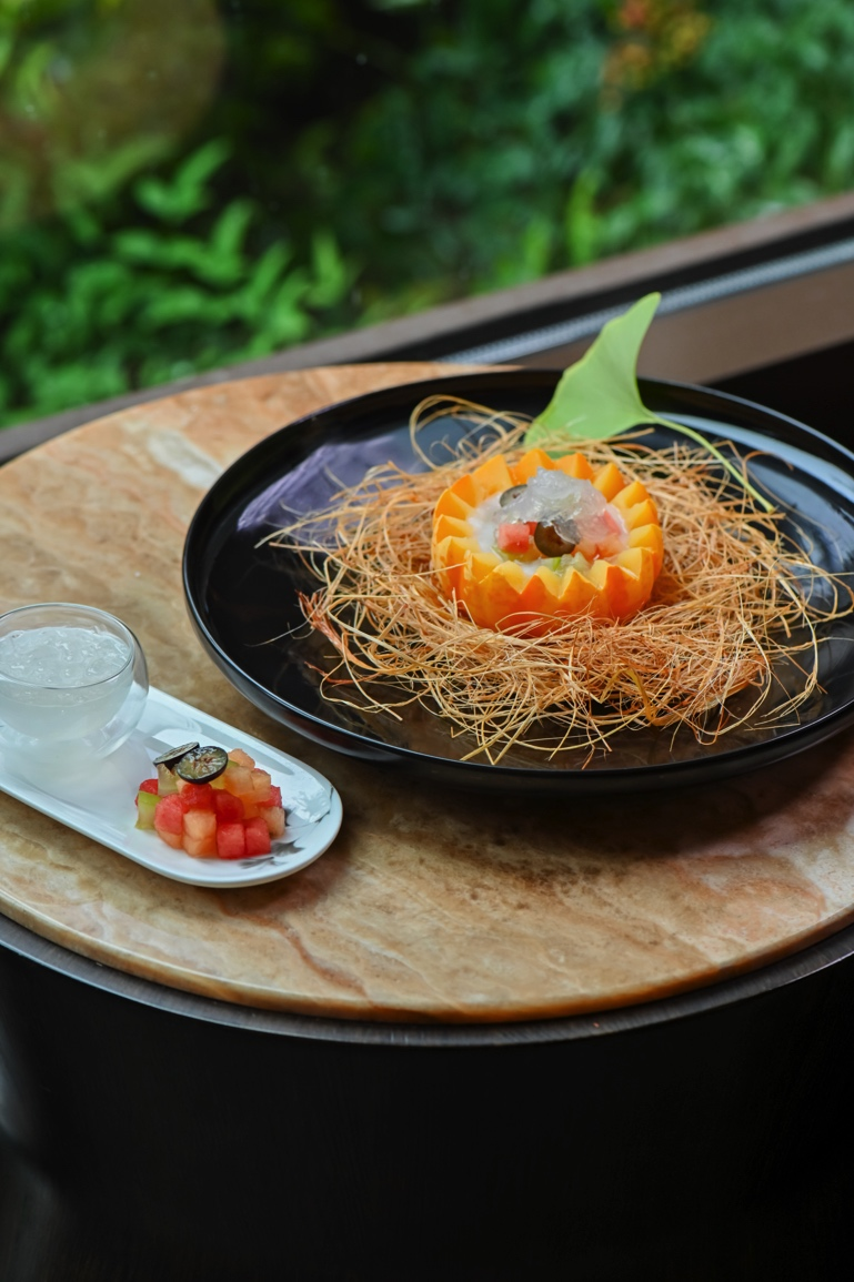 金巢玉露應燕歸,取形制優(yōu)美的菊瓜為器,蒸至甘軟后注入香濃椰奶,綴入繽紛鮮果與晶瑩燕窩。瓜體的清甜與椰韻的馥郁相融,燕絲穿梭其間,營造出豐富而和諧的味覺體驗,寓意金秋歸巢,溫潤養(yǎng)人。